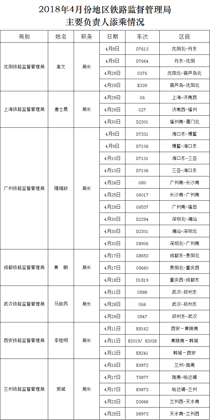2018年4月份地區鐵路監督管理局主要負責人添乘情況