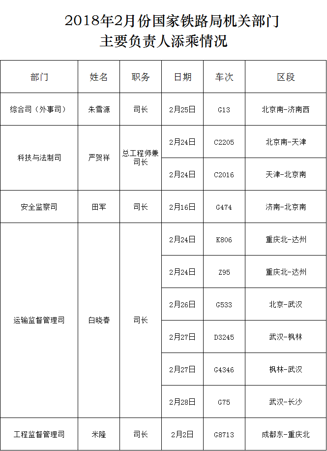 2018年2月份國家鐵路局機關(guān)部門主要負責人添乘情況