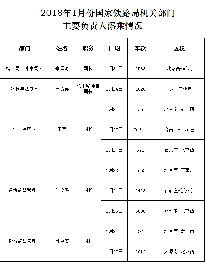 2018年1月份國(guó)家鐵路局機(jī)關(guān)部門主要負(fù)責(zé)人添乘情況