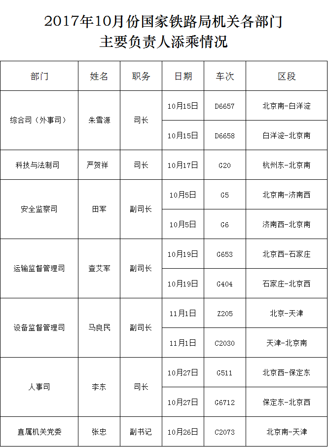 2017年10月份國家鐵路局機關各部門主要負責人添乘情況