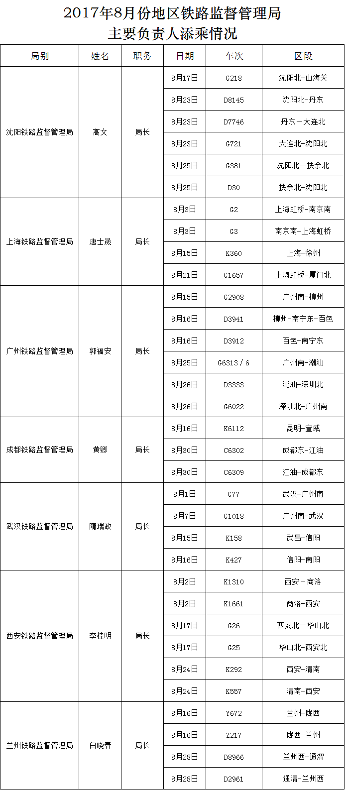 2017年8月份地區鐵路監督管理局主要負責人添乘情況